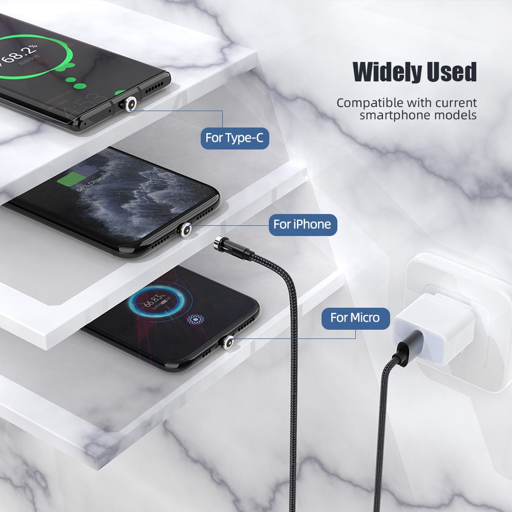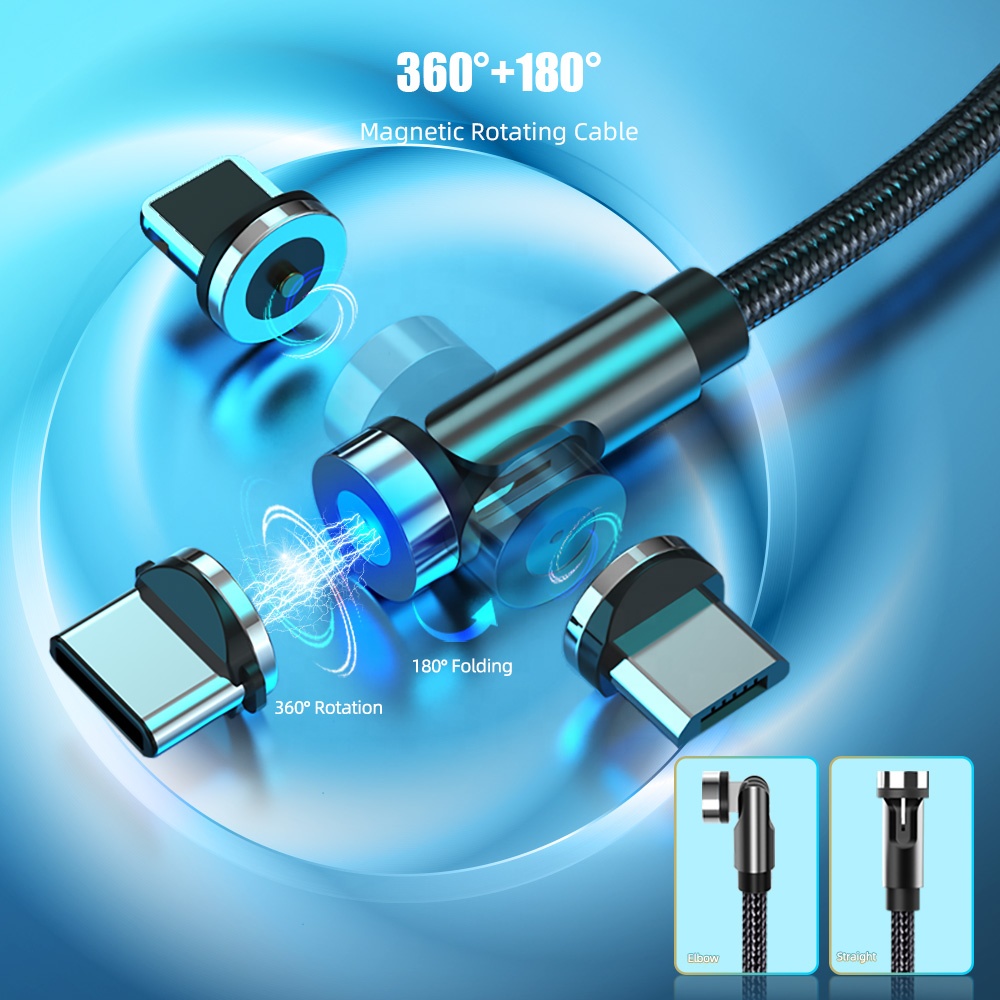 3 in 1 Led Micro USB C Mobile Phone Charger for Lighting 540 Degree Rotating Magnetic Charging Cable