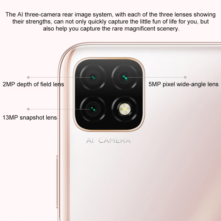 4. Equipped with 4 cameras, 13MP( main camera, F1.8)+5MP(wide angle, F2.2)+2MP(depth, F2.4) three rear cameras and 8MP (F2.0)front