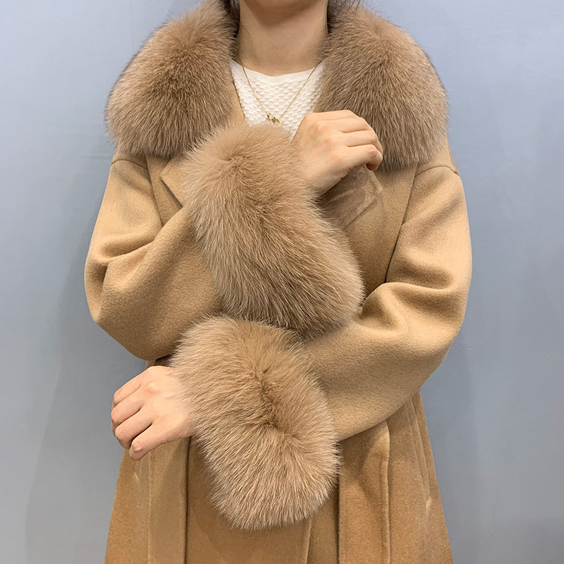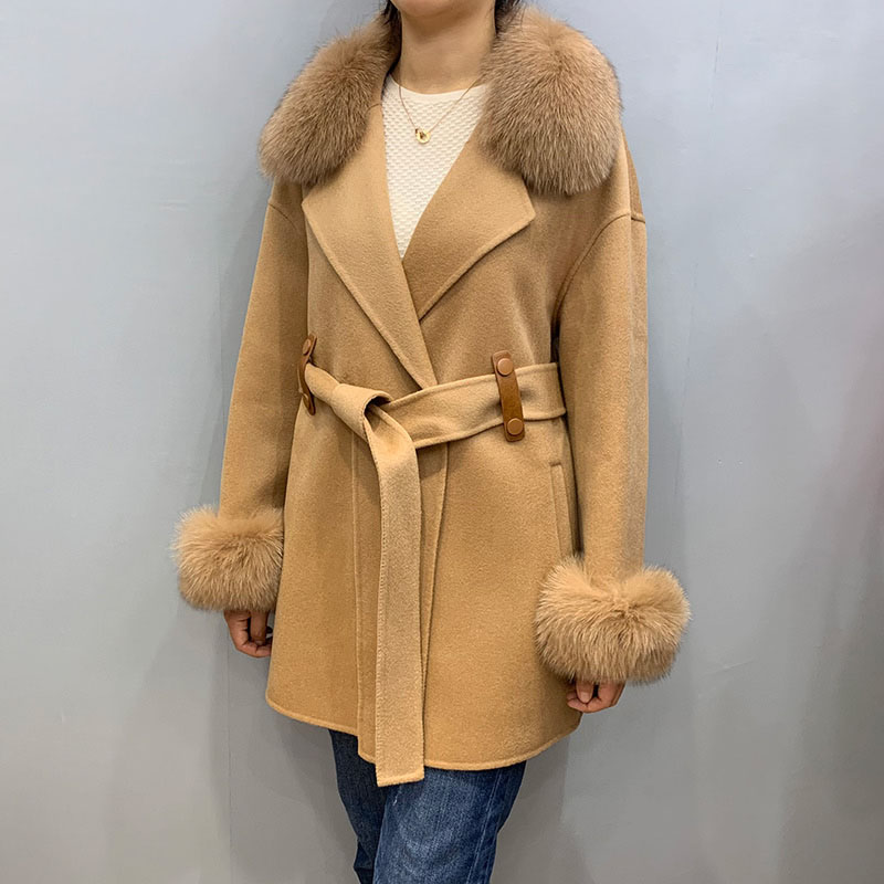 Women Winter with Belt Real Fox Fur Collar and Cuff Wool Coat Cashmere Coat Jacket