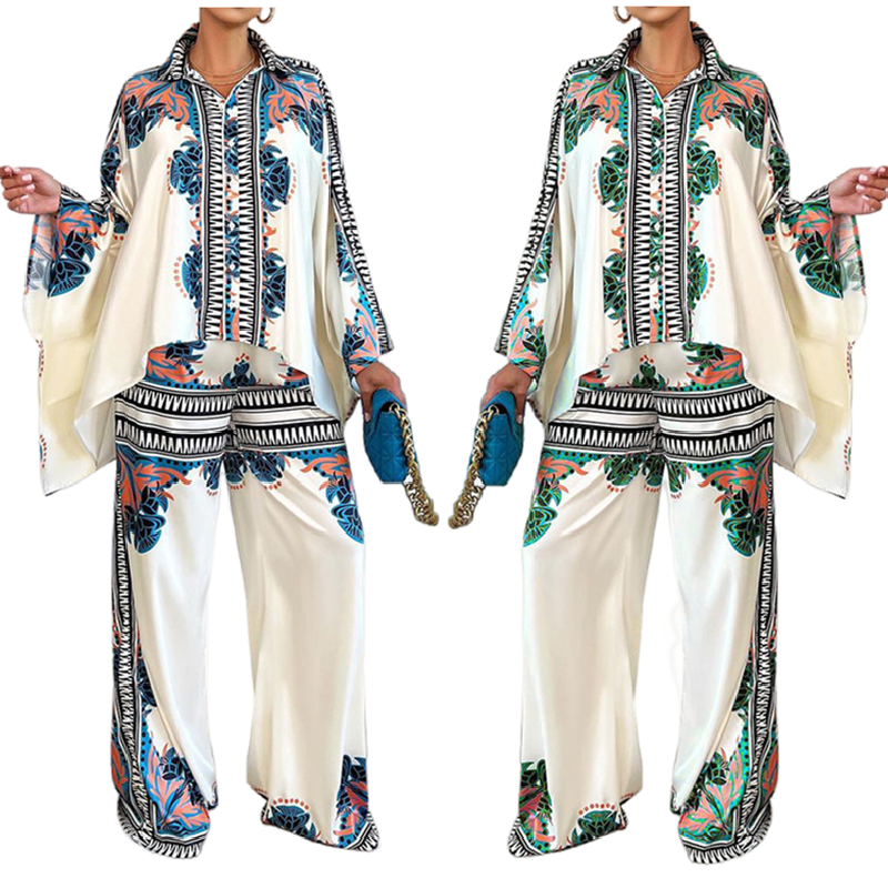 ZL2006 New Design Summer Elegant Printed Bat Sleeve Shirt And Pants Set Loose Top Wide Leg Pants Set Women Two Piece Pants Set